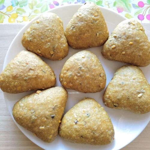 「ダルカレー風おにぎりパン」を作りました。 生地にカレー粉とミックスダルを練り込み、やさしいマイルドカレー味に。ふわっとした弾力と、ほっくり甘い豆のナッツのような食感がアクセント。 やさしい味わいで食べやすいおにぎりパンです。